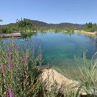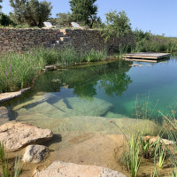 A special concern in the design of the swimming pond was the most natural possible integration into the landscape, with the aspect of a quarry filled with water. In addition, it should serve as a source of drinking water for bees and birds and as a habitat for endangered animal and plant species and increase biodiversity. It was included in the list of potential water bodies for the reintroduction of the Balearic Green Toad, along with another small aquatic biotope that we created nearby.